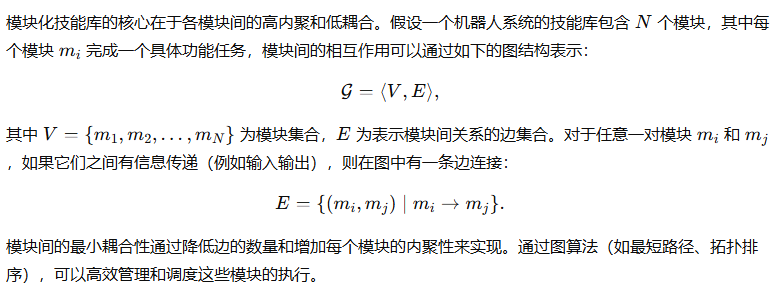 模块化技能库(Modular Skill Library)是为了增强机器人系统的灵活性和可扩展性而设计的核心组成部分。它通过将复杂的任务分解为多个可独立执行的小模块,使得各个模块可以在不同任务之间共享和复用,从而大大提升了系统的效率与可维护性。