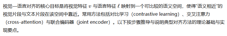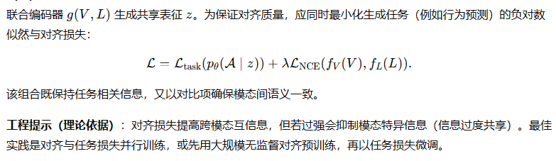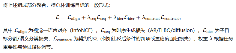 或等价地学习一组可交互的潜在表征 zzz(或分层潜变量)使得动作生成与模态对齐成为高效的下游推断问题。跨模态表示设计应满足三条要求:信息保真(与动作相关的信息尽量保留)、语义可对齐(不同模态在同一语义空间中可比)、条件可分离(高层语义与低阶执行可分离以便层次化控制)。下文依次讨论对齐、时序条件化与语义层次化的具体方法与数学推导。