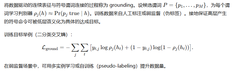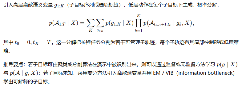 任务通常天然层次化:高层表述目标/意图(semantic goal),中层负责子任务(subgoals / options),低层执行连续控制(motor commands)。构造语义层次化表示既有利于数据效率(高层抽象泛化更好),也便于将学习策略与传统规划/符号方法结合。下文按步骤给出层次化概率模型、接口规范与符号化/接地(grounding)方法。