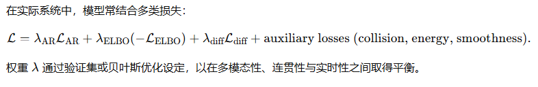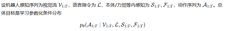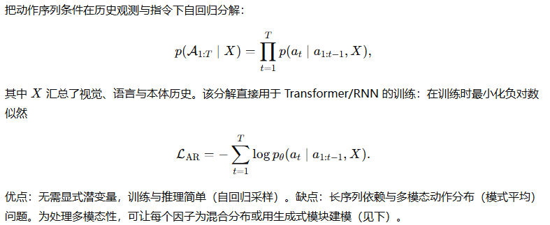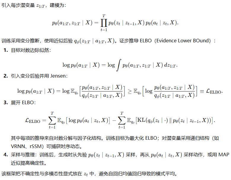 动作是时序的—决策依赖历史观测与动作。时序条件化的核心是以合适的概率分解和潜变量模型来表达历史依赖与不确定性,常见路径有自回归建模、条件潜变量序列模型(sequential VAE / state-space models)与条件扩散过程。下面逐步推导关键形式化表达与训练目标。