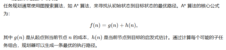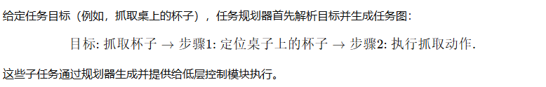 任务规划的目标是将高层目标(如“抓取桌上的杯子”)分解为具体的可执行子任务。任务规划器需要依据任务约束、环境状态和已有知识,制定出执行步骤,并确保步骤间的合理性。