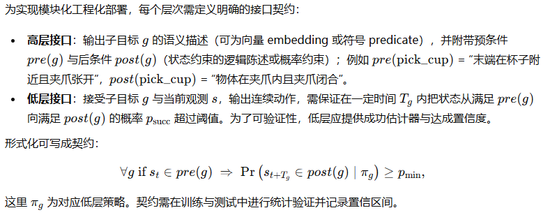 任务规划和低层控制的分工契约是指在高层任务规划与低层控制之间建立有效的协作机制。任务规划模块负责从高层次的目标生成子任务,并将这些子任务传递给低层控制模块执行。低层控制则负责处理具体的动作生成和执行。