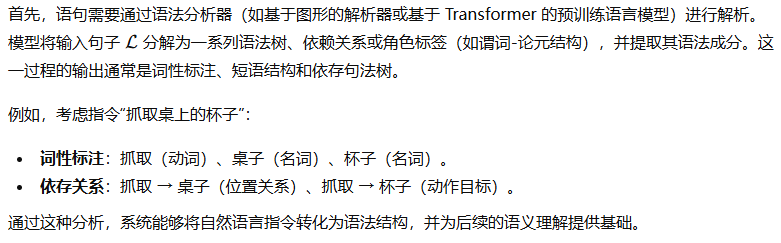 语法分析为后续的语义理解奠定基础。语义理解的目标是从句法结构中提取出指令的实际意图。例如,指令“抓取桌上的杯子”可以拆解为以下几个任务元素: