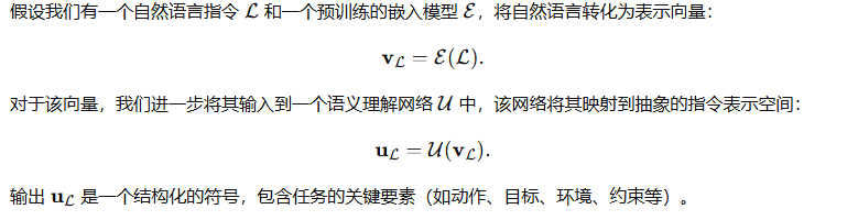 指令的抽象化通过识别和抽取指令中涉及的核心任务元素(如动作、目标、约束等),并将其转化为一个高层次的表示(例如符号化、任务图或约束条件)。这一过程中,系统需要利用语义图(或语义角色标注)将动作与目标之间的关系明确化。