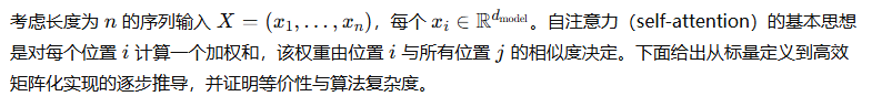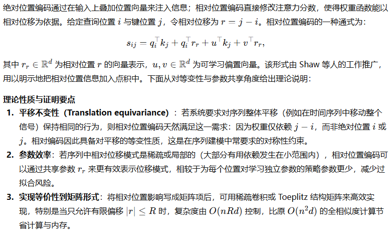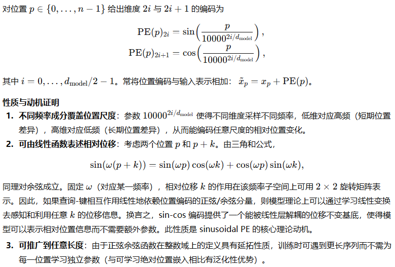 自注意力本质上对序列位置不具位置信息感知能力(其操作对输入的排列不变),因此需要引入位置编码(positional encoding)来注入位置信息。位置编码应当满足对下游任务有利并在数值上与模型表示相容。下面给出两类主流方法:绝对位置编码(sinusoidal)与相对位置编码,并给出其性质证明。