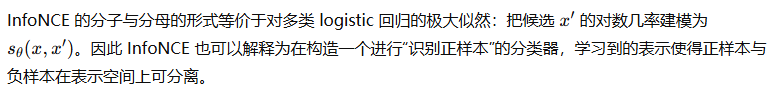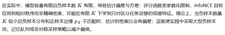 对比学习(InfoNCE)在无限容量与充分的负样本数下等价于估计条件密度比,并给出互信息的下界,理论上可解释其判别性优势。