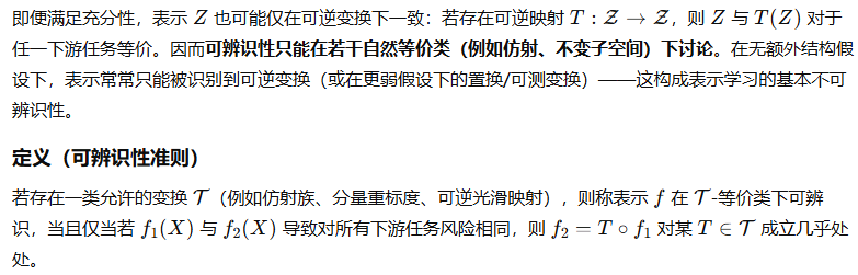 此定义提供了可辨识性问题的形式化框架:若希望更强的可辨识性,需要对 T\mathcal{T}T 引入先验或对数据生成过程作出结构性假设(见非线性ICA等工作)。