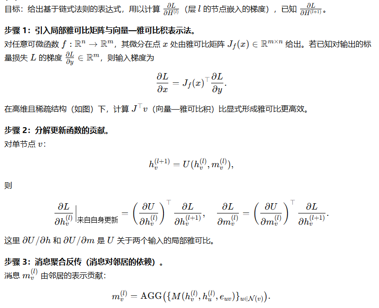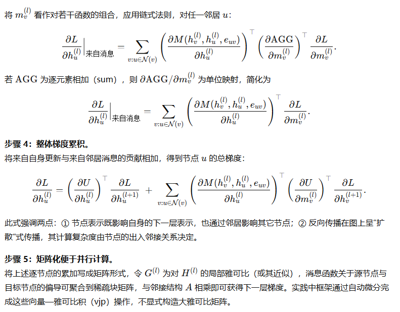 图神经网络(GNN)以图为结构单元,其基本操作是消息传递(message passing)与节点态的更新。为清晰起见,先给出单层通用消息传递格式,再对其反向传播(梯度传递)做严格推导。