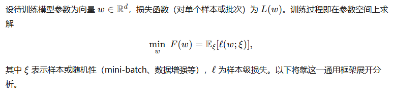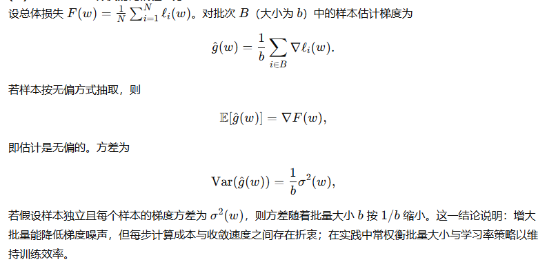 训练过程中不可避免地引入随机性:样本采样、数据增强、dropout、近似梯度等。这些随机项使得梯度估计存在方差,从而影响收敛速率与稳定性。本节给出梯度方差的定量表达、SGD 的收敛界推导与实用准则。