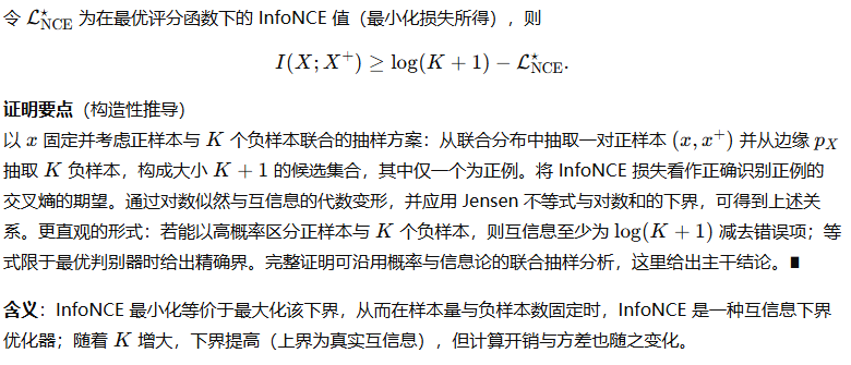 对比学习通过构造正样本对(positive pairs)和负样本对(negative pairs)并训练判别器来学习表示。最常用的损失是 InfoNCE。对比学习的关键数学主题是其与互信息(mutual information, MI)最大化的关系、最优评分函数的形式以及有限负样本下的近似误差。