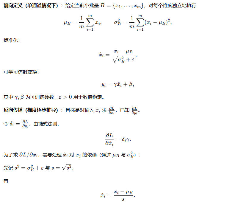 归一化层通过对激活进行标准化改变训练时激活的尺度分布,从而改善训练的稳定性与收敛速度。以下对 Batch Normalization 的前向与反向推导给出完整数学步骤,并讨论 Layer Normalization 的差异与稳定性影响。