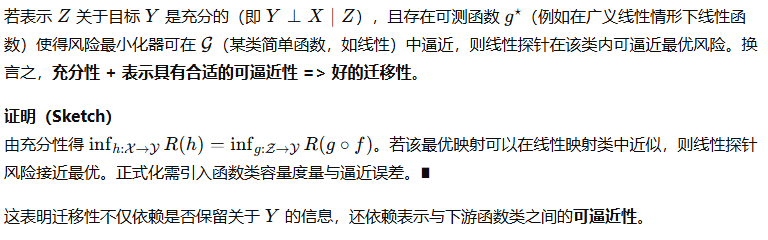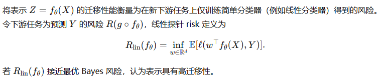 表示学习的最终目标通常是学习对多个下游任务可迁移的好表示。下面给出形式化的迁移性定义、线性探针理论分析与若干泛化界定的严格陈述。