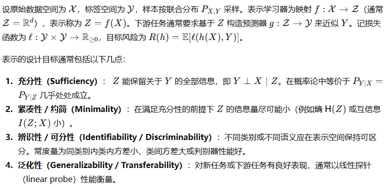 本节作为教材性质的正式章节,系统地、逐步地给出表示学习与自监督学习的数学目标、可辨识性准则、对比学习的损失与其与信息论的关系、重构/预测/生成型自监督任务的严格推导,以及表示可迁移性与泛化的界定。所有结论均在明确的假设下证明或推导,便于在课堂和科研中直接使用。