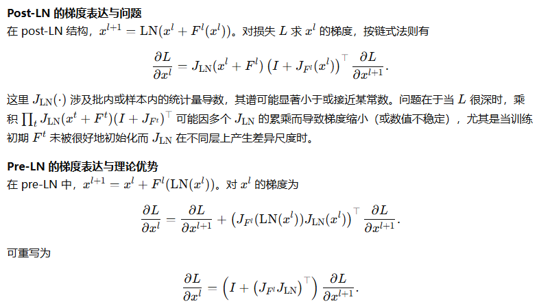 LayerNorm 对单样本的特征维度进行标准化,具体定义在前一节已推导。其对梯度传播的影响体现在改变了子层输入的分布、缩放梯度的传播以及对学习率的稳定化。下面分别分析 pre-LN 与 post-LN。