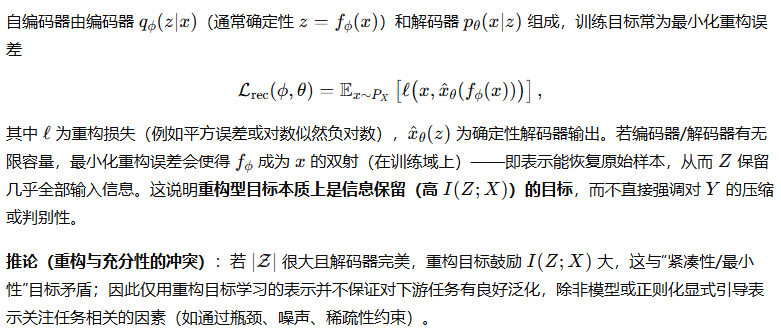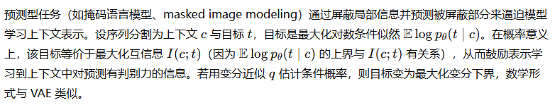 自监督方法还包括重构型(autoencoding)、预测型(masked/predictive)、生成型(variational/AR)任务。下面分别给出这些目标的严格数学形式、推导与其信息学解释。
