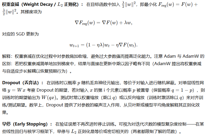 正则化技巧(L2、Dropout、早停)在数学上分别对应参数收缩、随机噪声注入与迭代次数的复杂度控制。