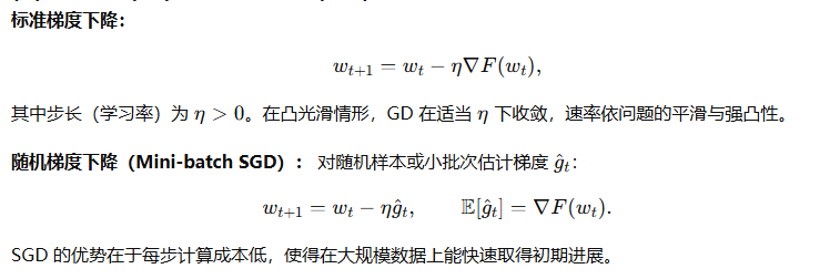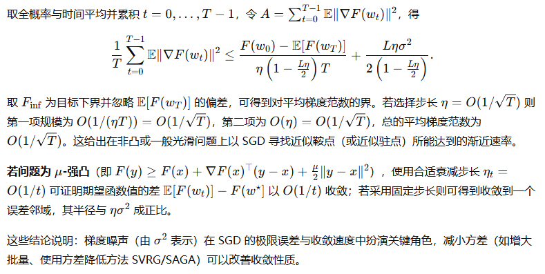 随机性(mini-batch)使梯度估计无偏但有方差,方差与批量大小近似按 1/b1/b1/b 缩小;SGD 在非凸情形下以 O(1/T)O(1/\sqrt{T})O(1/T) 的速率减少平均梯度范数,而在强凸情形下可取得更快收敛。