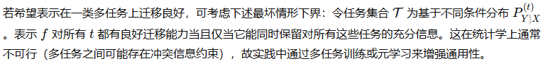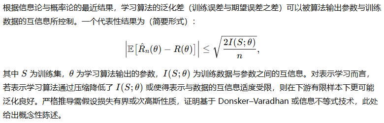 表示的迁移性既受表示是否保留任务相关信息(充分性)影响,又受表示与下游函数类的可逼近性与表示维度(对泛化界的影响)制约。信息论和统计学习理论为迁移性与泛化提供了量化界限与设计指南。