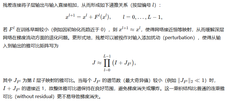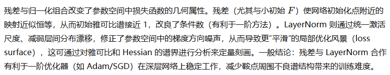 残差连接的存在使得初始化策略可以偏向小幅输出(如 Xavier/He 初始化)以保证 FFF 初始时小,从而利用恒等映射的保护性。