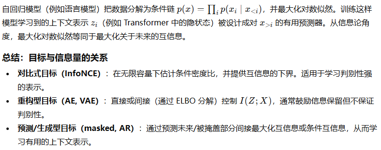 重构/变分/预测/生成型自监督目标从信息论角度可分别解释为促进信息保留、实现信息压缩-重构权衡或最大化上下文互信息。
