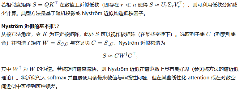 谱或核近似理论:低秩或 Nyström 方法的误差可用谱衰减与截断秩 rrr 的关系来定量。若相似度矩阵谱快速衰减,低秩方法有效。