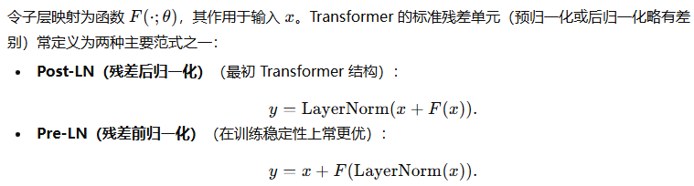 Transformer 中典型的模块化结构为残差连接(residual connection)+ 归一化(LayerNorm)+ 前向子层(如 Multi-Head Attention 或前馈网络)。以下从数学角度逐步分析残差与归一化对训练稳定性、梯度传播以及表达能力的影响。