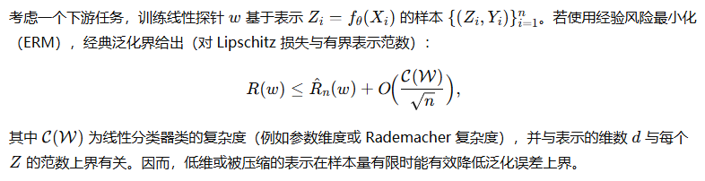 在有限样本 regime 下,紧凑而判别性强的表示有利于训练简单下游模型并获得低泛化误差。