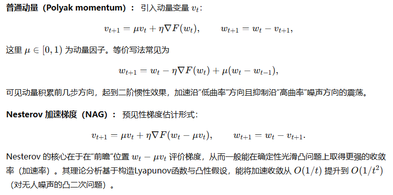 对光滑(L-smooth)与凸问题,GD 与带动量的方法有确定性收敛率;Nesterov 在凸光滑情况下可达到加速收敛。