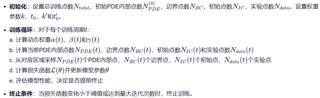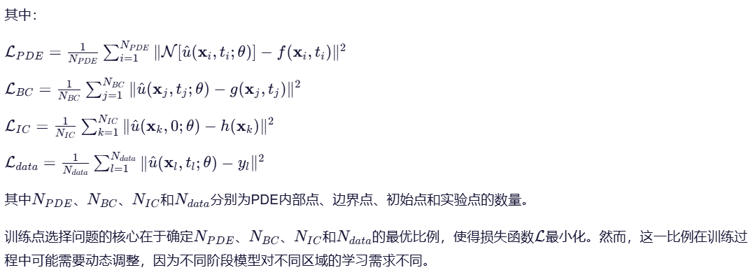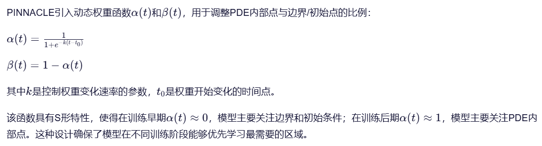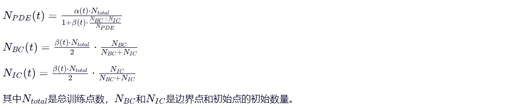 该公式确保了在训练早期,边界和初始点的比例较高,随着训练进行,PDE内部点的比例逐渐增加,同时保持边界和初始点之间的相对比例不变。