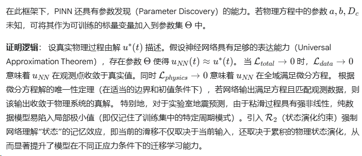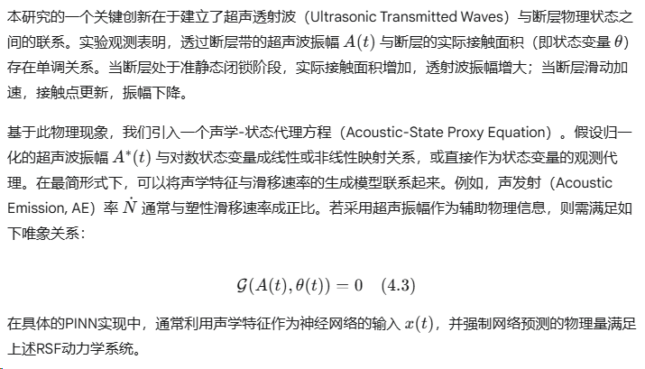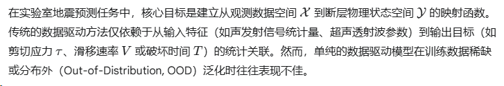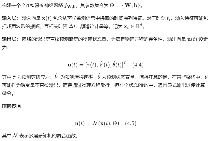 本节推导一种结合物理约束的深度学习框架——物理信息神经网络(Physics-Informed Neural Network, PINN)。该框架不仅拟合观测数据,还将控制断层滑动的物理定律(速率-状态摩擦定律,Rate-and-State Friction, RSF)以及声学监测数据与物理状态之间的本构关系作为正则化项嵌入损失函数,从而在小样本条件下实现高精度的状态预测与参数反演。