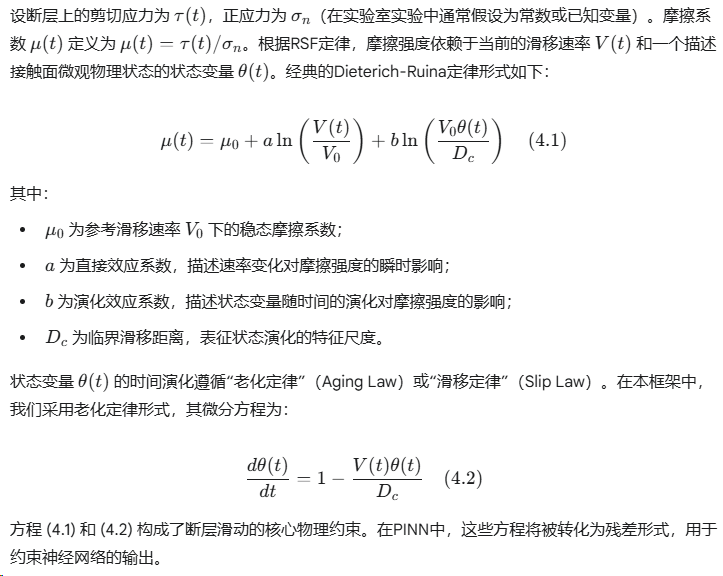 断层的力学行为由速率-状态摩擦定律(RSF)控制,这是描述断层从闭锁到滑动失稳过程的经典本构方程。为了构建PINN的物理残差,我们首先定义控制系统的状态变量与演化方程。