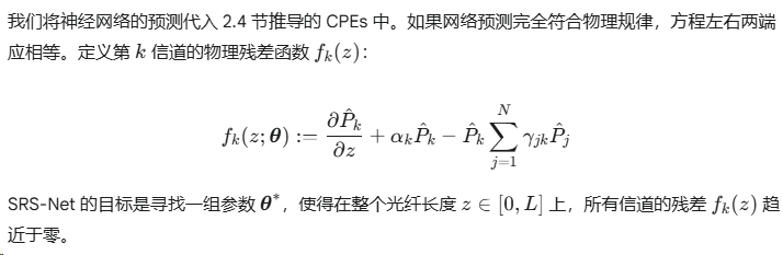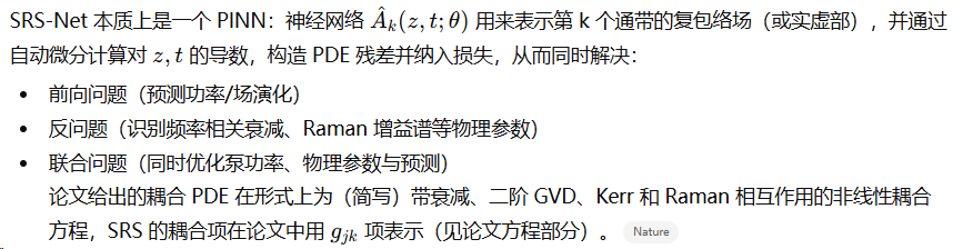 SRS-Net 本质上是一个 PINN:神经网络 A^k(z,t;θ) \hat{A}_k(z,t;\theta)A^k(z,t;θ) 用来表示第 k 个通带的复包络场(或实虚部),并通过自动微分计算对 z,tz,tz,t 的导数,构造 PDE 残差并纳入损失,从而同时解决: