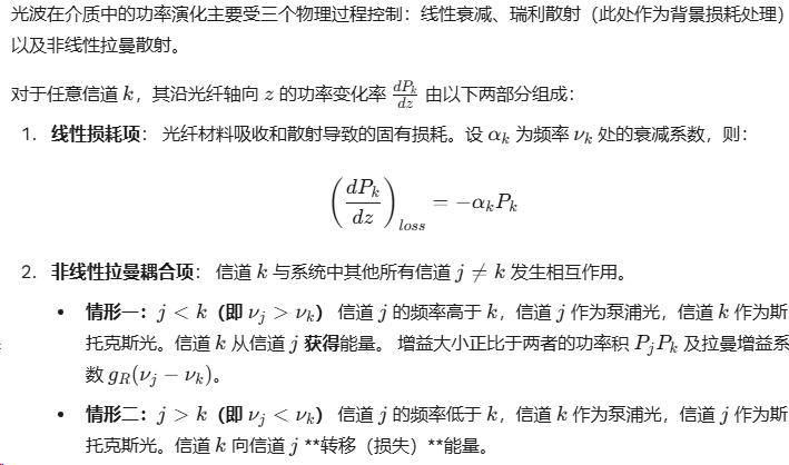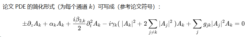 论文给出的耦合 PDE 在形式上为(简写)带衰减、二阶 GVD、Kerr 和 Raman 相互作用的非线性耦合方程,SRS 的耦合项在论文中用 gjkg_{jk}gjk 项表示(见论文方程部分)。Nature