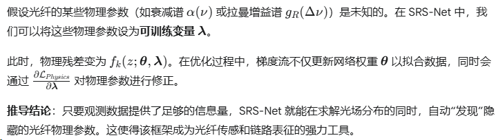 SRS-Net 并非简单的黑盒模型,而是一个物理可解释的计算框架。它通过严格推导的耦合功率方程(CPEs)定义了假设空间,利用自动微分消除了数值离散误差,并通过多任务损失函数实现了从稀疏数据到全域物理场的高精度重构。这一算法原理为非线性光纤光学中的复杂系统建模、参数辨识及逆向设计提供了统一且严密的数学解法。