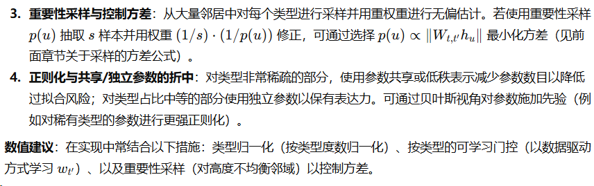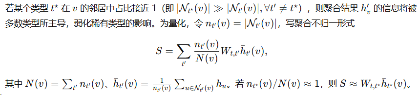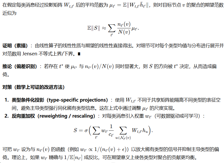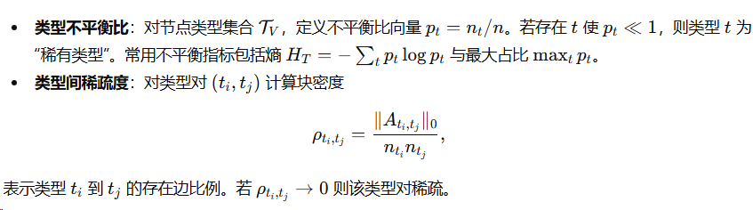 异构图常出现的两个核心挑战是:不同类型节点/边数量极不平衡(type imbalance),以及某些类型之间连通性极为稀疏(sparsity)。下面以数学形式刻画这些现象,并推导它们对消息传递与梯度的影响。