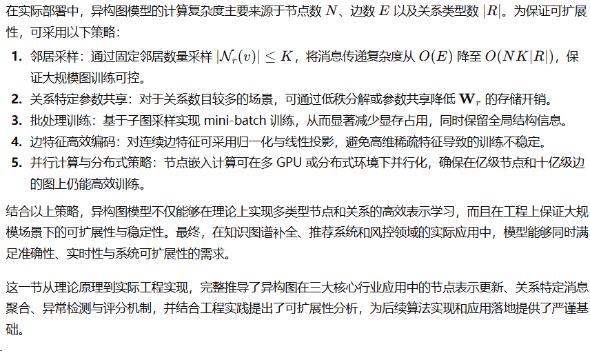 在工业界和商业场景中,异构图神经网络(Heterogeneous Graph Neural Networks, HGNNs)由于其能够刻画节点和边的多样性以及复杂关系的能力,在知识图谱、推荐系统以及风控等领域表现出极大的潜力。然而,在实际应用中,性能优化和系统可扩展性是制约其广泛落地的关键因素。本节将从应用场景出发,详细推导各类异构图模型的核心原理,并分析其工程实现和性能考量。