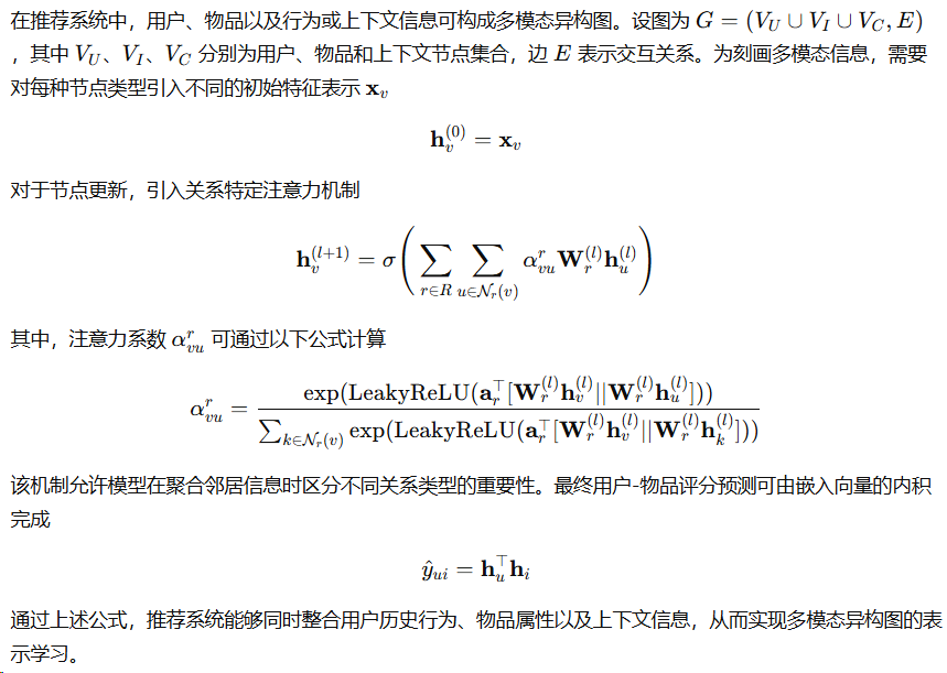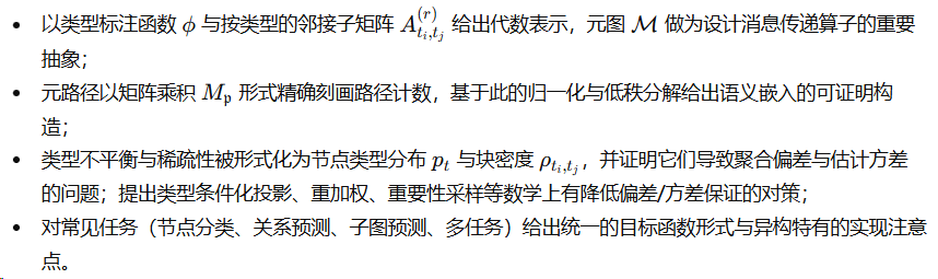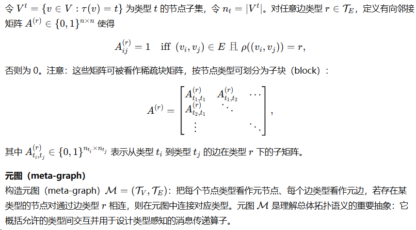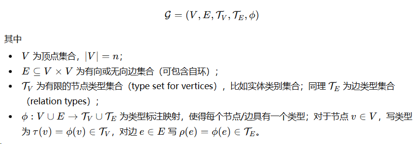 本小节把异构图从基础构件到任务层面做了完整、严密的数学形式化: