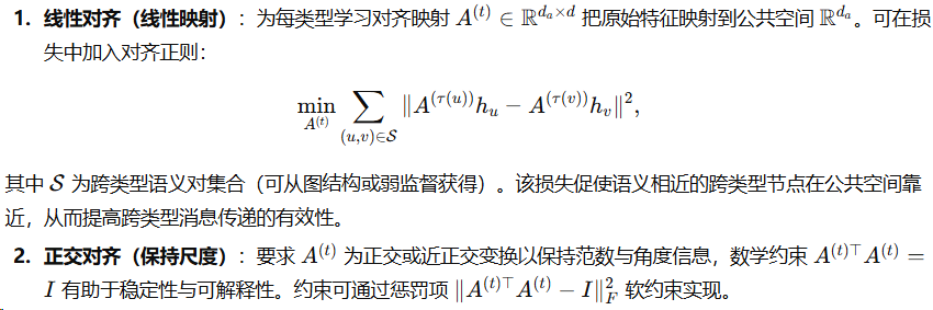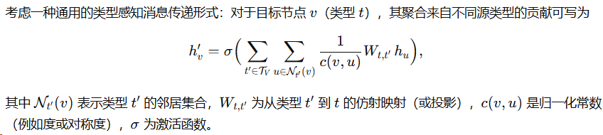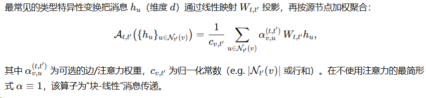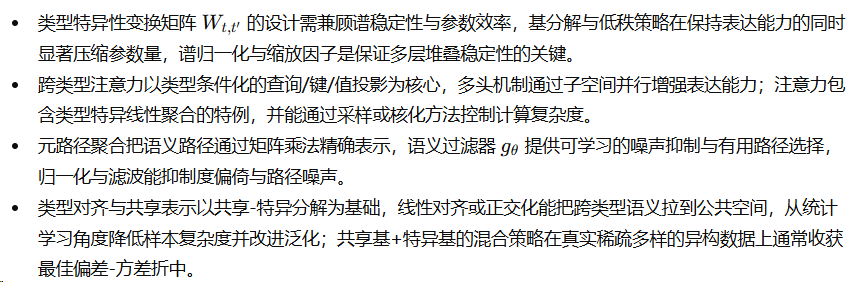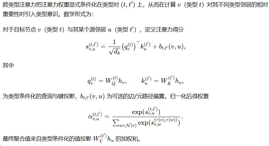 本节由浅入深地推导了异构图神经网络中四类核心机制的数学基础与实现要点: