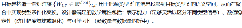 本节从算子与代数的角度系统推导异构图神经网络中核心的聚合与跨类型变换机制。先在统一符号下给出类型条件化消息传递的一般形式,然后分别推导(1)类型特异性变换矩阵的设计与性质;(2)跨类型注意力与多头机制的数学表达与包含关系;(3)基于元路径的聚合算子与语义过滤器的构造与稳定性;(4)类型对齐与共享表示的分解与识别性。每一小节都以定义、命题、引理与证明展开,步骤严密,可直接作为算法原理章节使用。