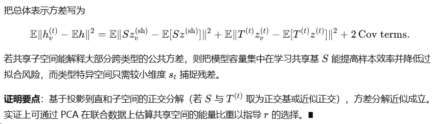 混合共享(shared + private):把层分解为共享基与类型特异基(如前);数学上可证明这种分解在样本稀缺与类型共性存在时具有最优的偏差-方差权衡。