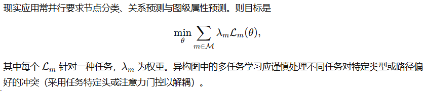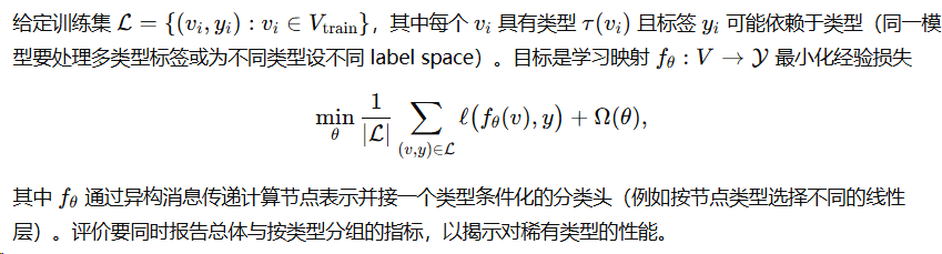 异构图上的任务常比同构图更复杂,因应不同层面的问题要用不同的目标函数与评价指标。下面以统一符号形式把主要任务类型形式化,并指出异构性带来的特殊性。