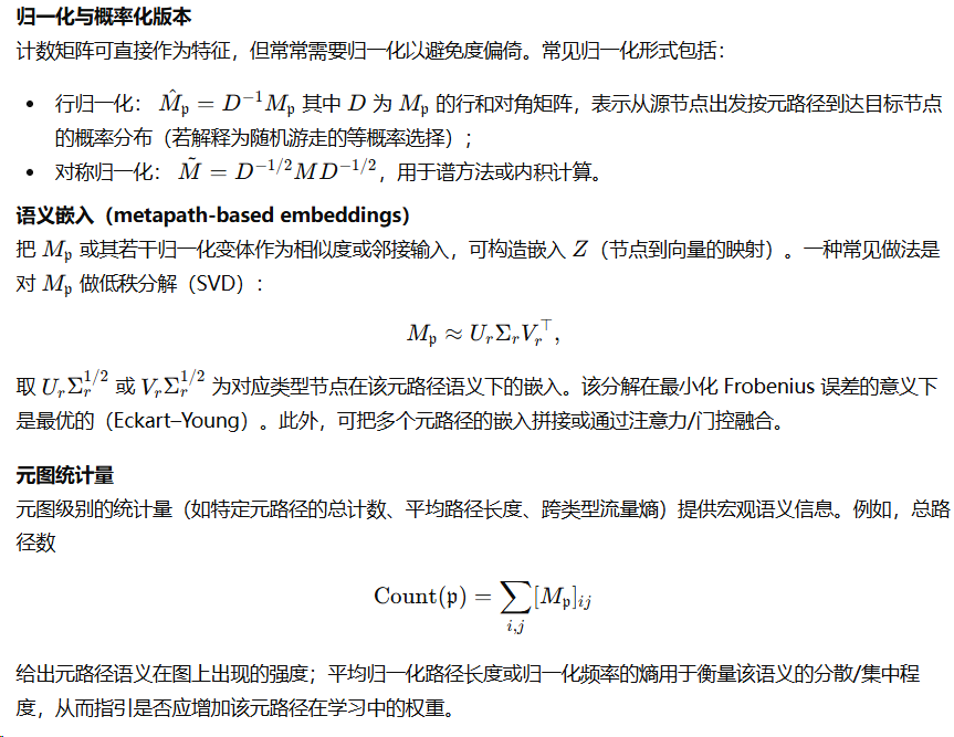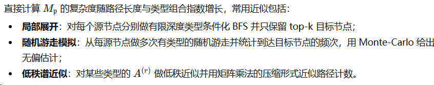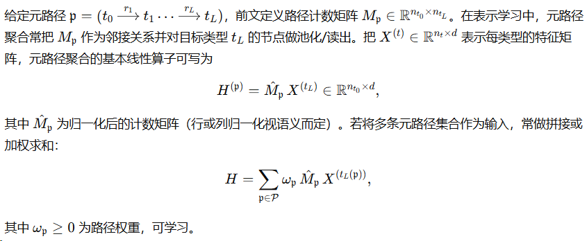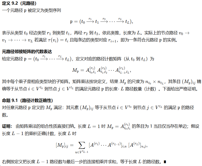 异构性最自然的表达是元路径(meta-path)与元图样式(metagraph pattern)。这些对象能把跨类型的语义路径编码为可计算矩阵运算。