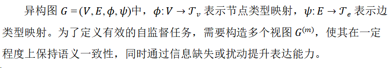 异构图中存在多种节点类型与边类型,使得其结构模式、语义依赖与统计特性远比同构图复杂。自监督学习在此类图上发挥关键作用:通过不依赖标注数据构建训练信号,使模型能够充分挖掘结构模式、类型依赖与语义一致性,实现高效的结构建模与知识迁移。由于异构图的多类型特性,自监督目标必须同时考虑局部结构、跨类型相关性与全局一致性,因此需要设计类型感知的视图构造机制、跨类型对比策略与多任务训练框架。本节从理论基础出发,系统构造异构自监督策略,并给出形式化推导。