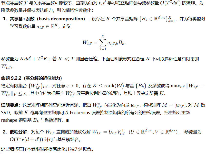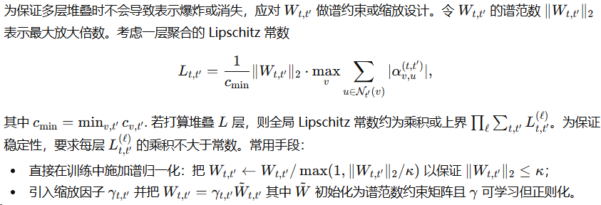 每一项设计均给出可检验的数学条件(谱界、Lipschitz 常数、低秩近似秩、采样方差公式等),便于在实现时把理论保证转化为具体的正则化、约束与超参数选择。按本节推导构造的异构 GNN 算子,既能保证数值稳定性与可扩展性,也能在类型复杂性与数据匮乏的现实问题中保持良好的泛化性能。