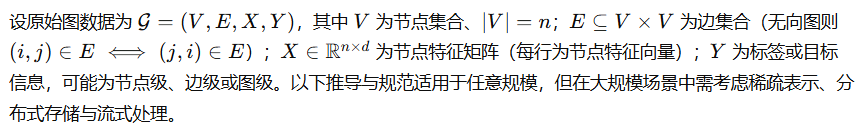 本章集中讨论大规模图神经网络系统中数据管道与预处理的理论基础、算法推导与工程实现要点。所给内容以数学/算法推导为主,目标为教材中“算法原理”与工程实现章的可直接使用条目:定义精确、推导严密、步骤完整,可作为实现与验证的规范。