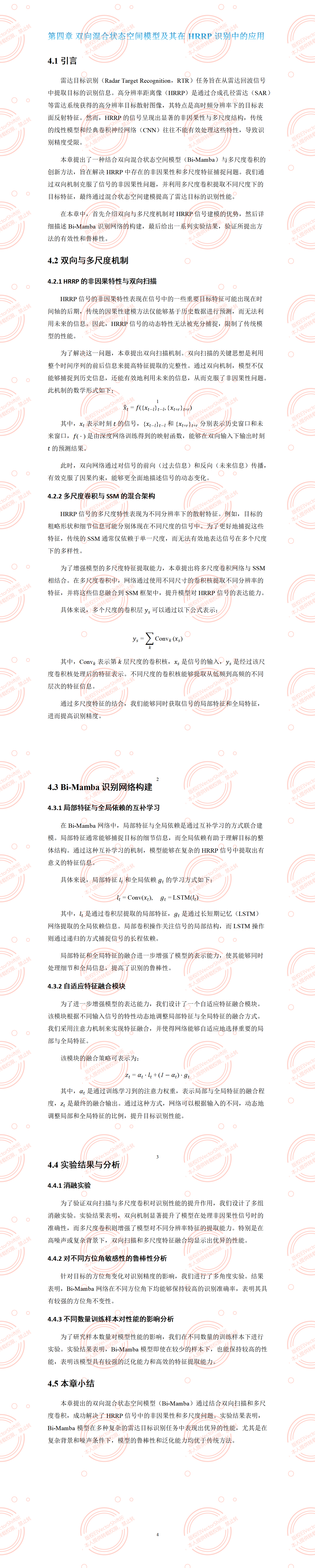 本章提出了一种结合双向混合状态空间模型(Bi-Mamba)与多尺度卷积的创新方法,旨在解决HRRP中存在的非因果性和多尺度特征捕捉问题。我们通过双向机制克服了信号的非因果性问题,并利用多尺度卷积提取不同尺度下的目标特征,最终通过混合状态空间建模提高了雷达目标的识别性能。