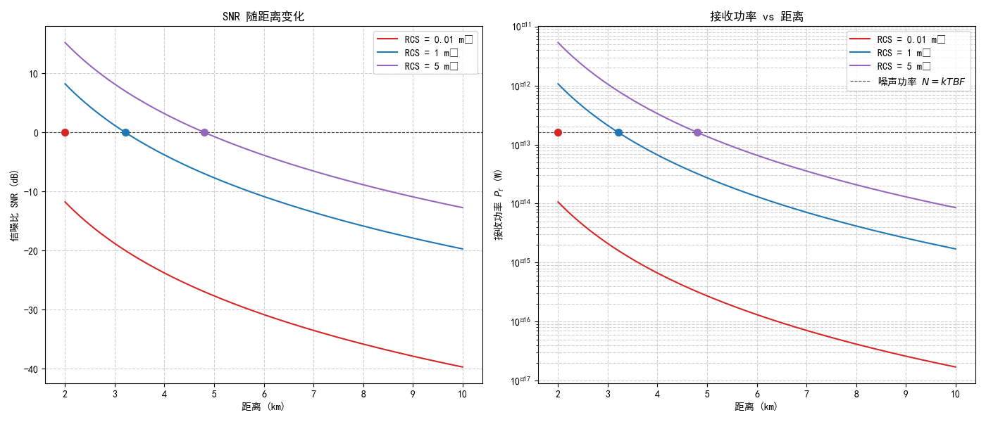 • RCS = 0.01 m² 时,SNR=0 dB 的距离 ≈ 2.00 km