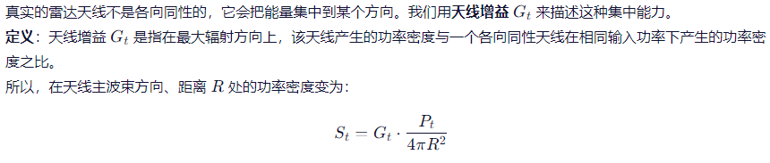 至此,我们得到了到达雷达天线口面处的回波功率密度。