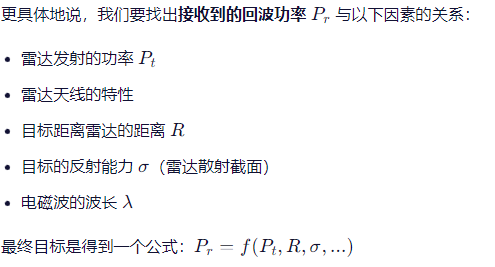 我们想知道:一个雷达发射信号后,从一个目标反射回来的信号,在雷达接收机处有多强?
