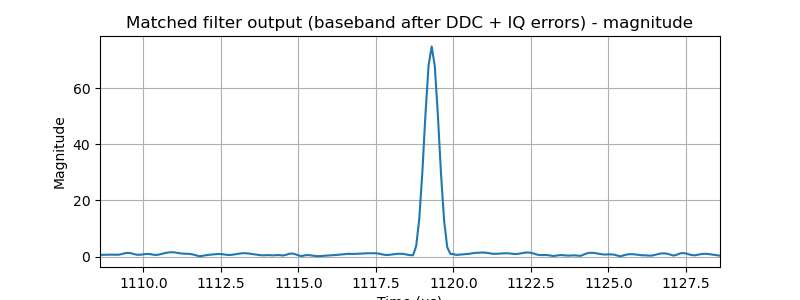 print(f"Compressed SNR (matched filter) on baseband after DDC + IQ errors: {snr_mf_bb_dB:.2f} dB")